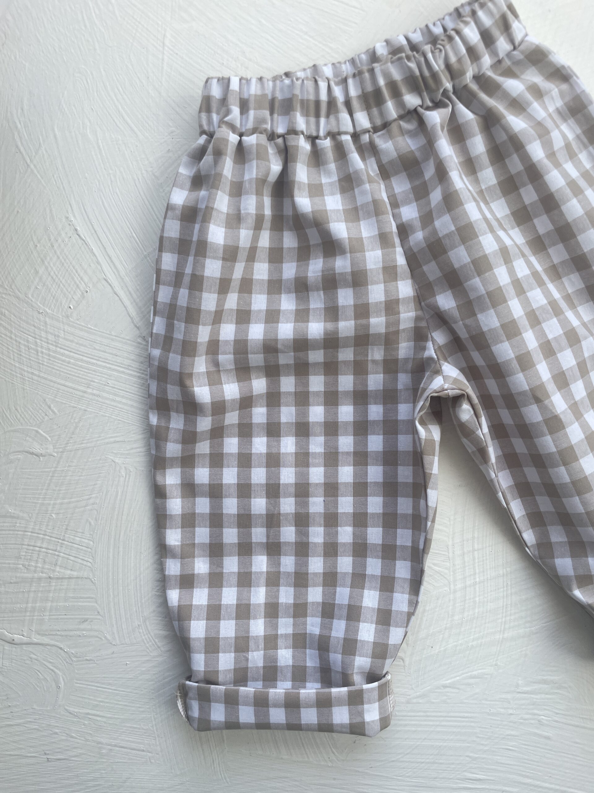 Spodnie dziecięce w kratkę vichy – bawełniane spodnie beżowo-białe