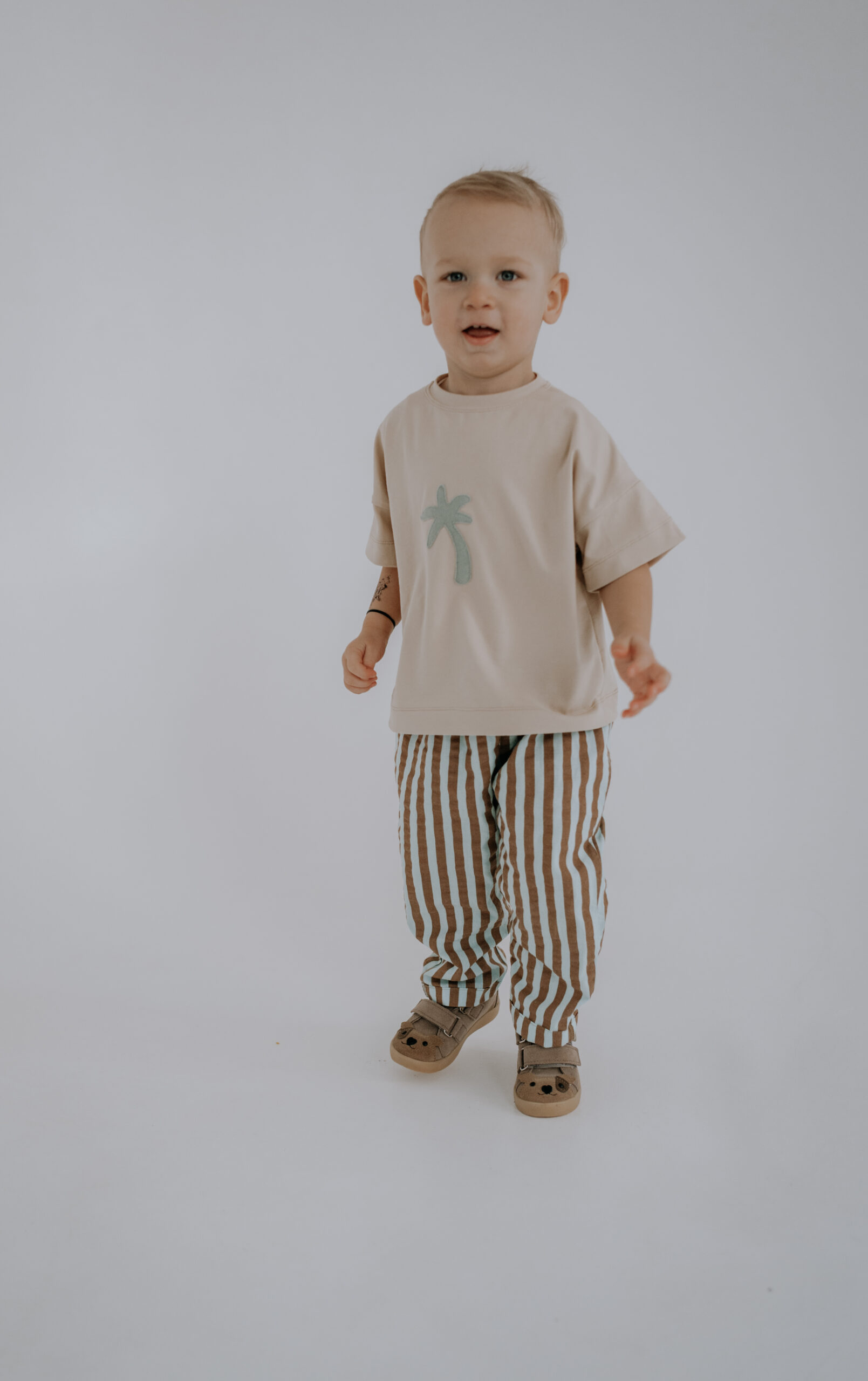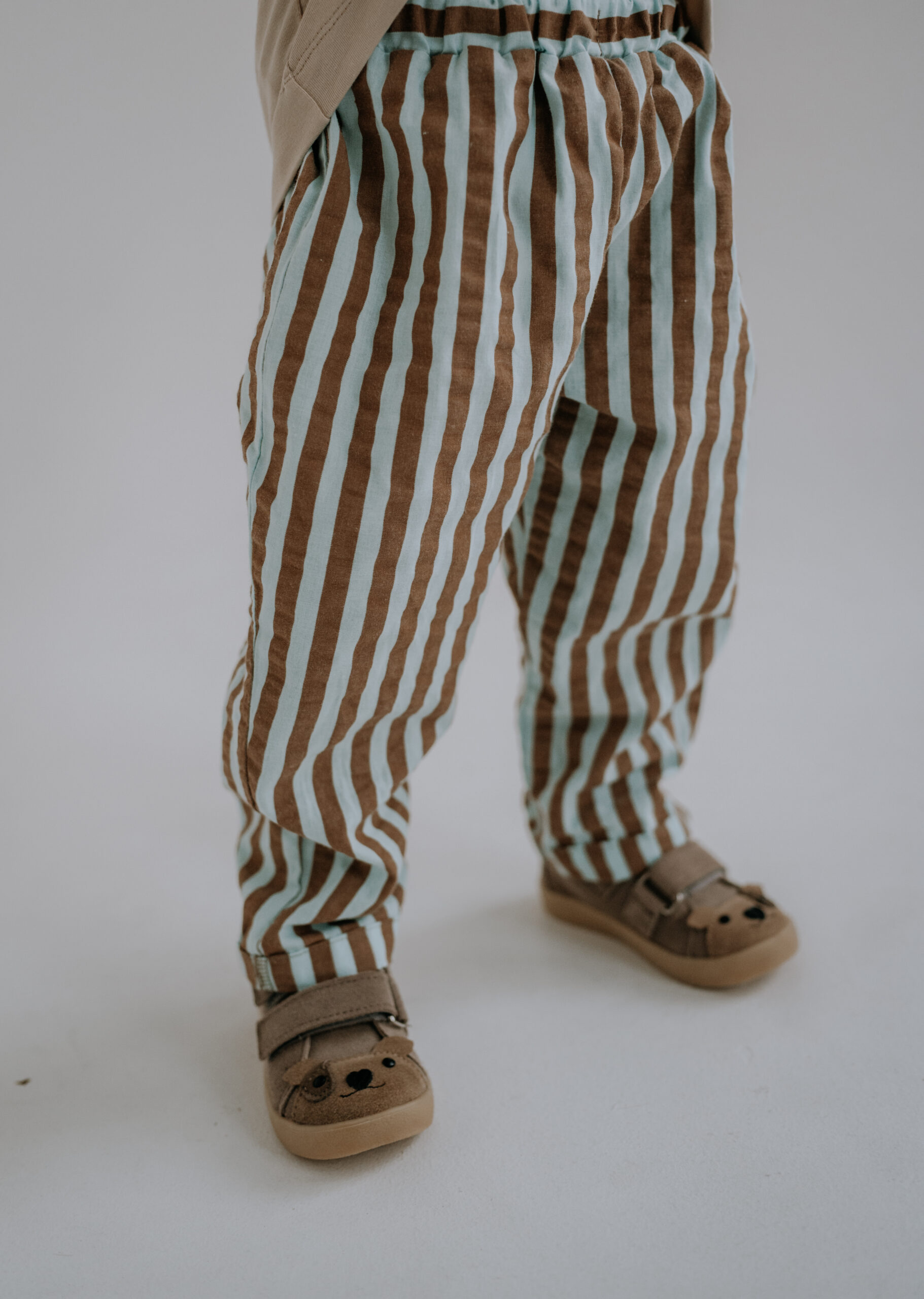 Charakterystycznym elementem spodni jest wzór w pionowe paski w kolorze brązowym i miętowym, który nadaje im wyjątkowego charakteru. Subtelne połączenie kolorów sprawia, że spodnie świetnie wpisują się w naturalną, dziecięcą stylistykę i łatwo można je zestawić z innymi elementami garderoby.