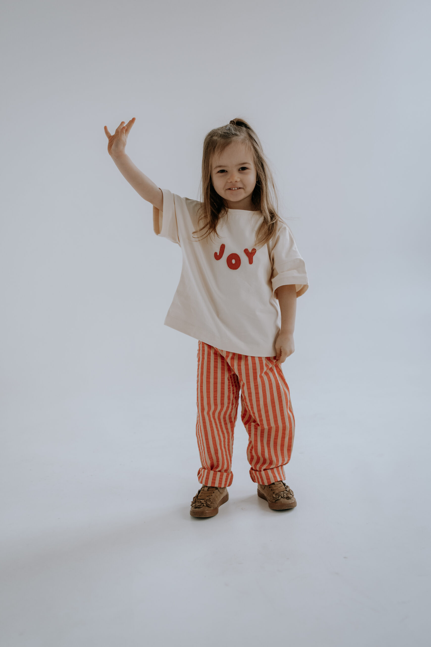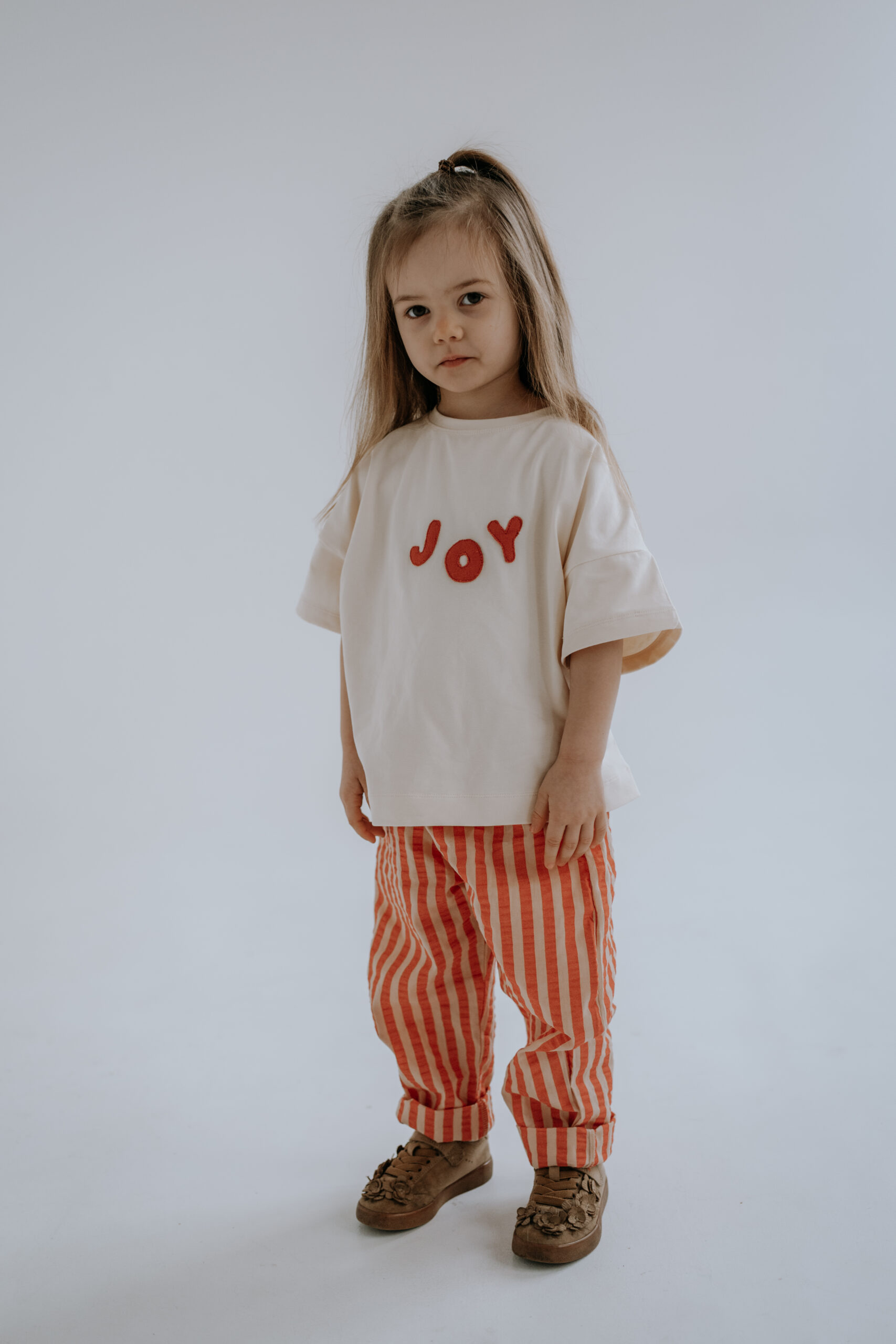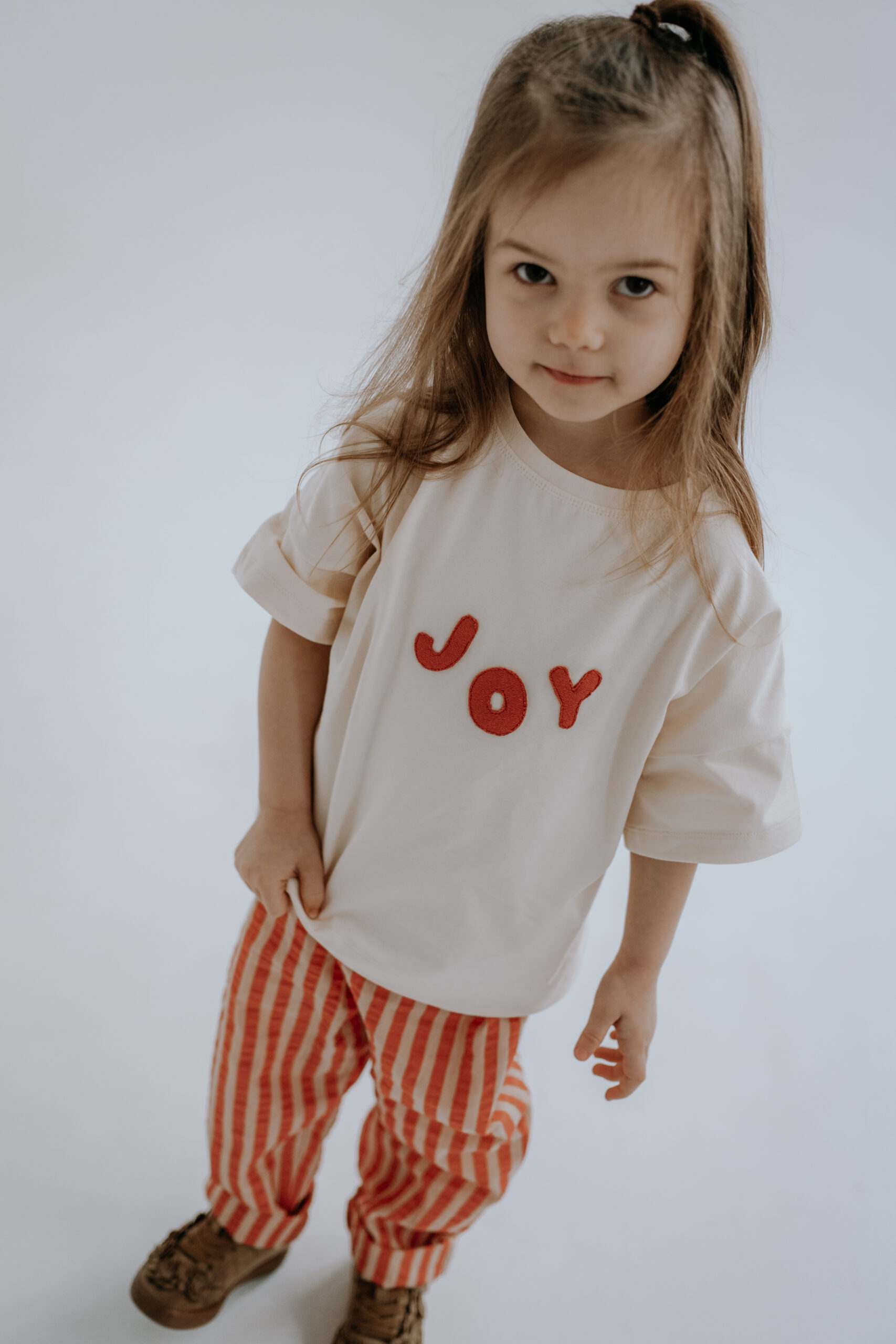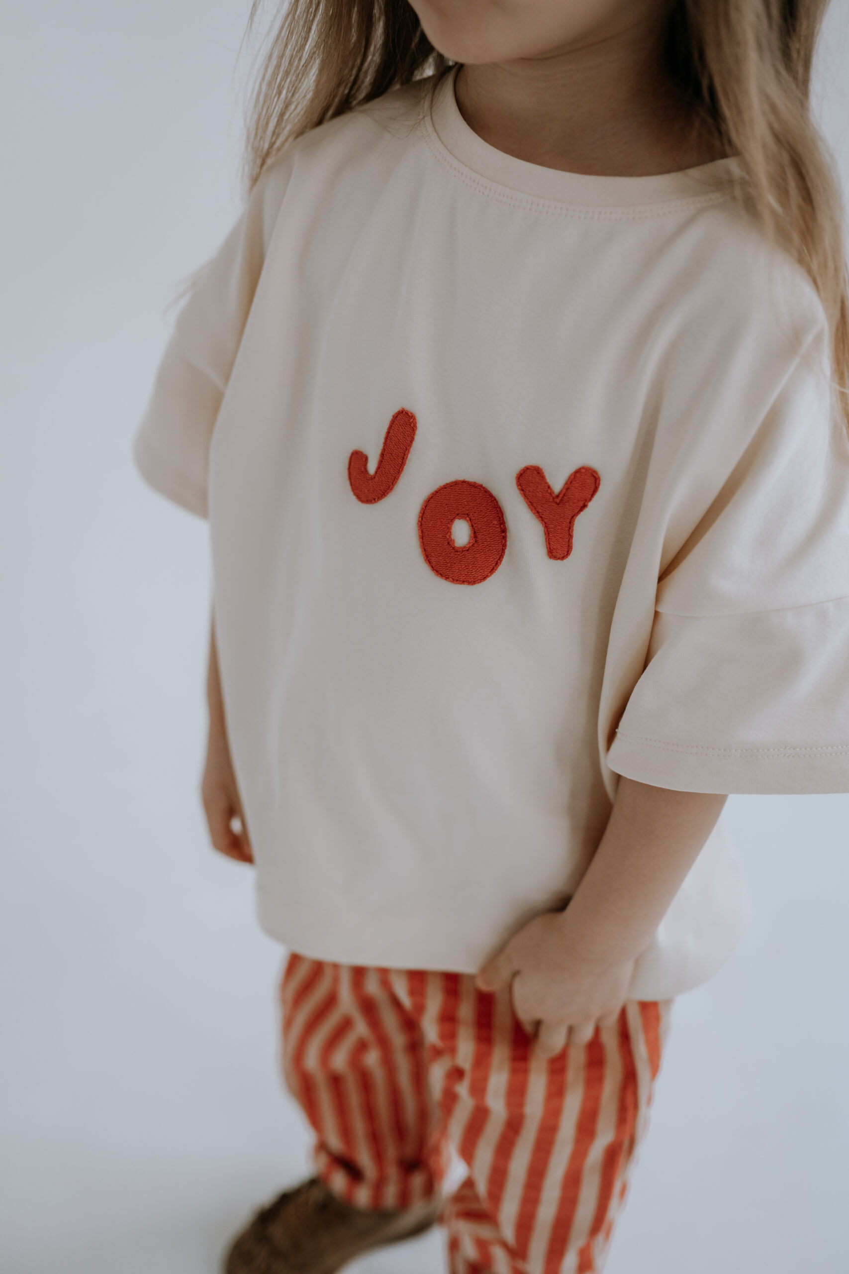 Kremowy T-shirt dziecięcy Joy oversize z ręcznie naszywanym czerwonym napisem to wygodna i stylowa koszulka dla dzieci, która pasuje do wszystkiego – od legginsów po sztruksy czy spodnie w paski.