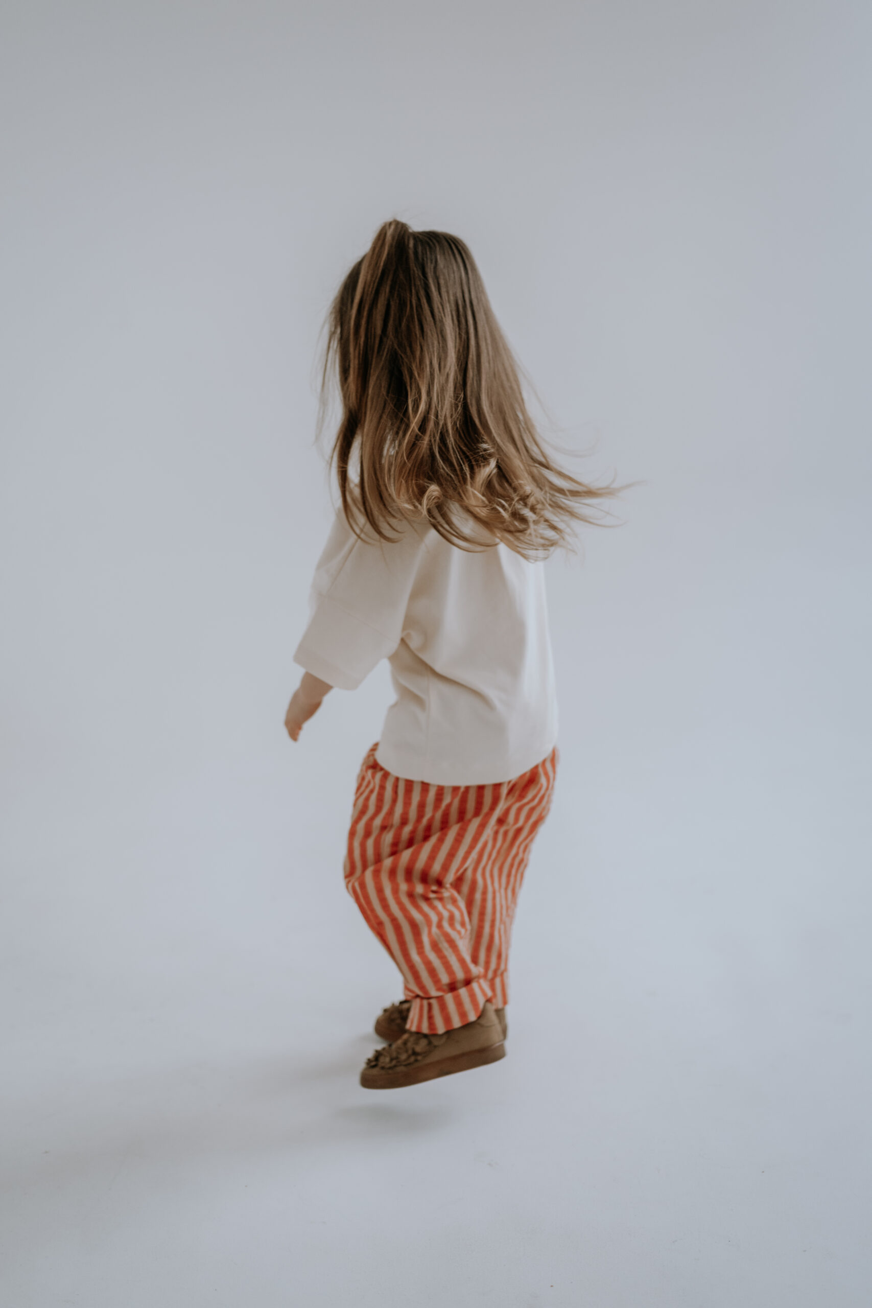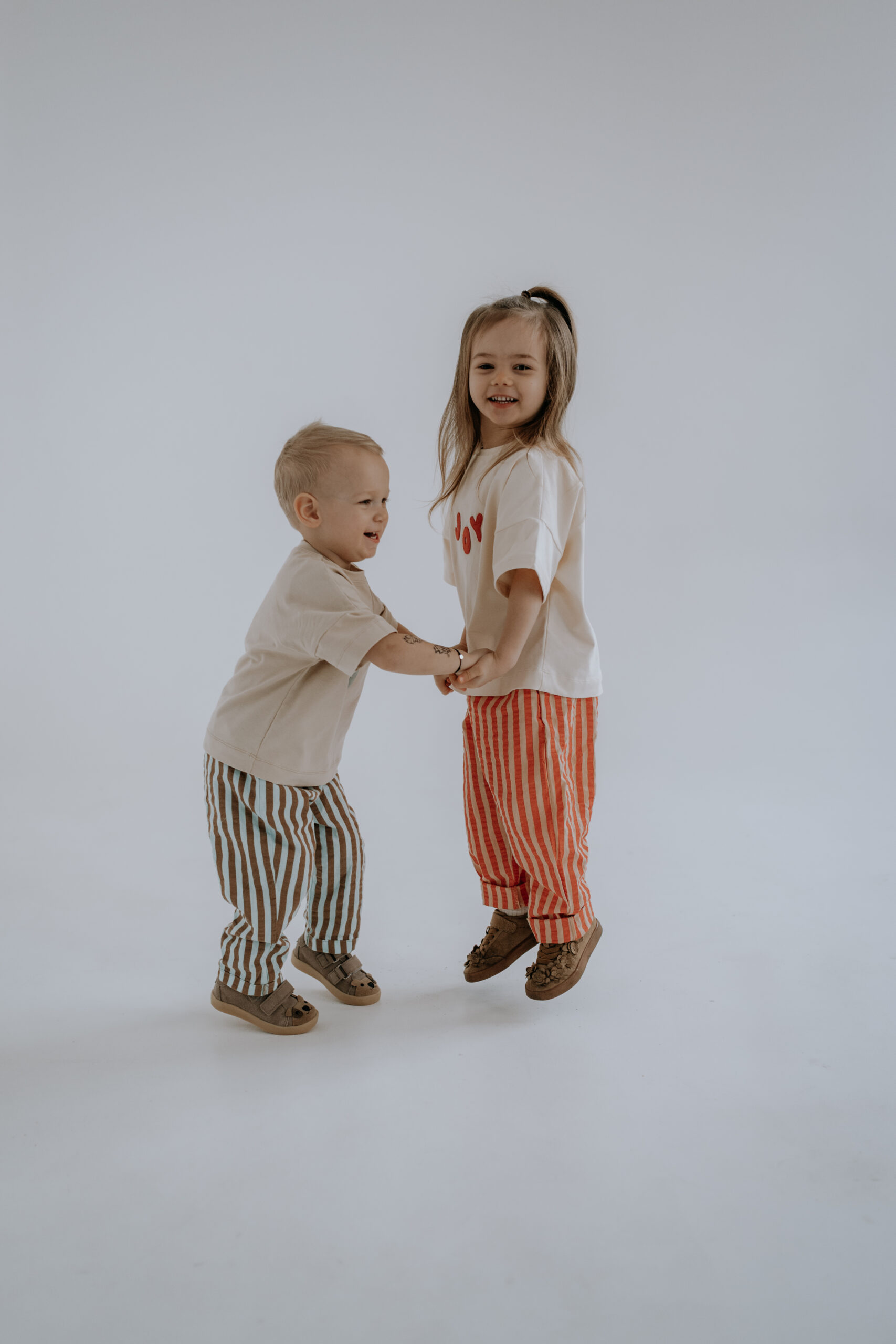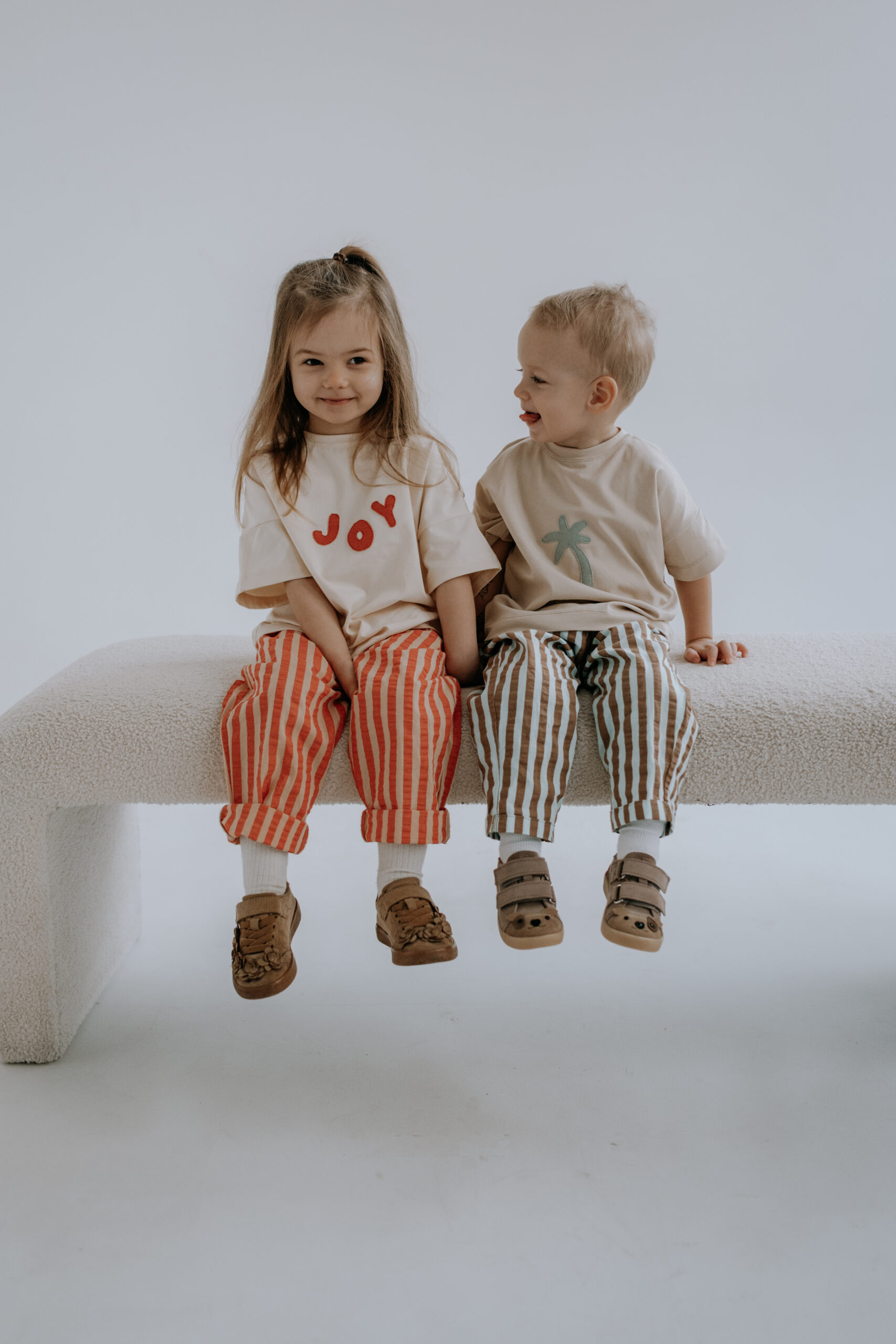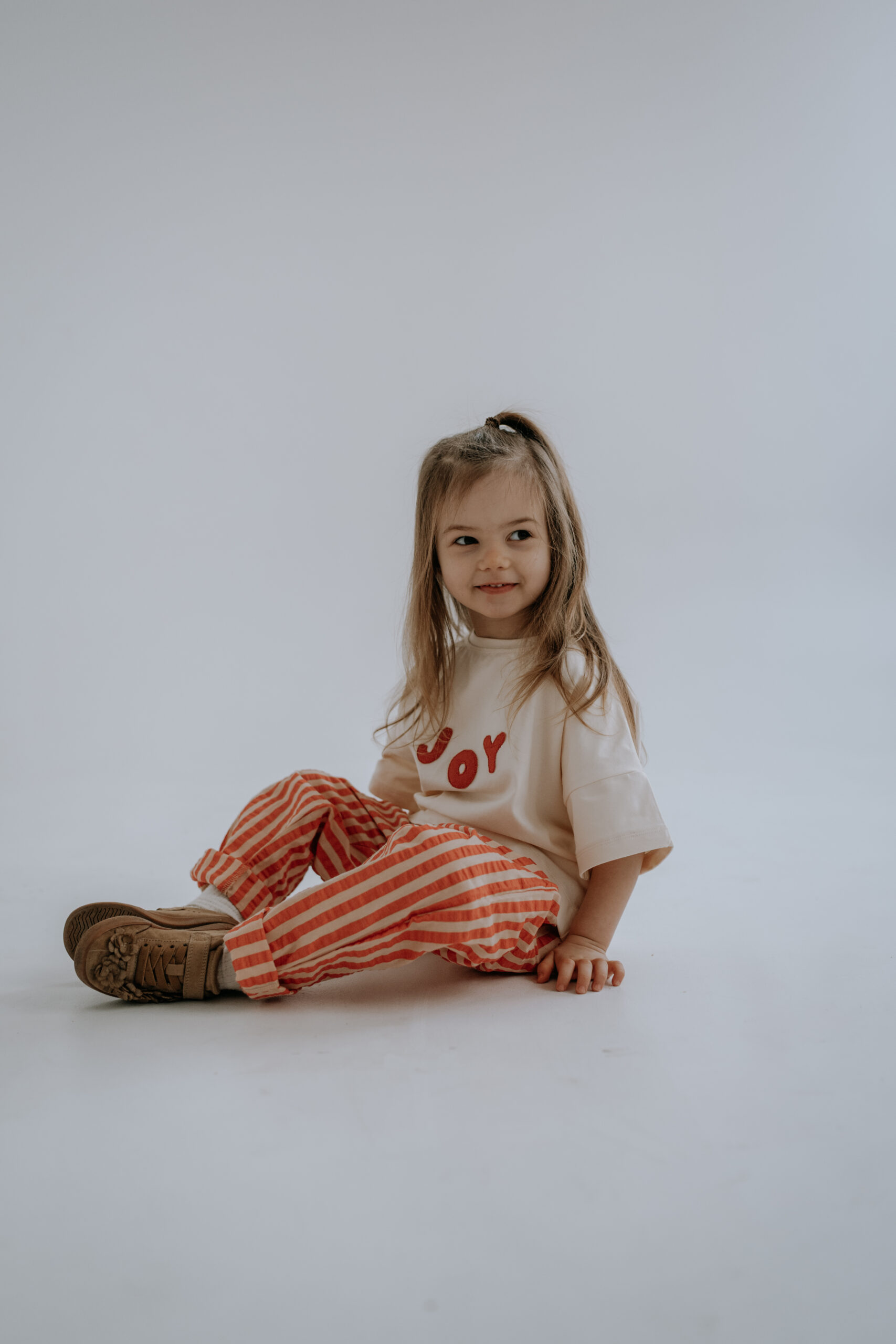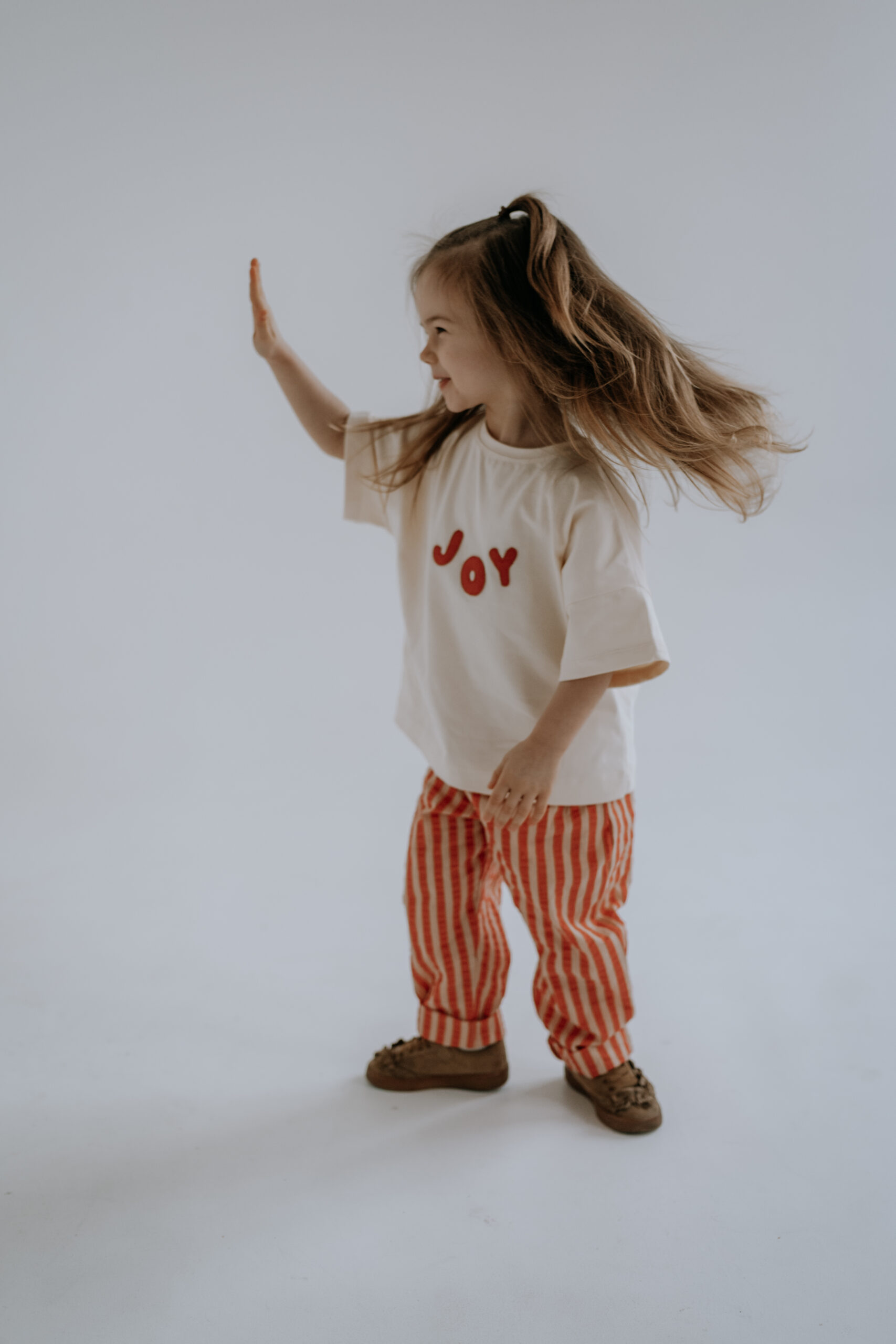 Kremowy T-shirt dziecięcy Joy oversize z ręcznie naszywanym czerwonym napisem to wygodna i stylowa koszulka dla dzieci, która pasuje do wszystkiego – od legginsów po sztruksy czy spodnie w paski.